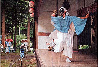 南佐久郡臼田町湯原の湯原神社で二十七日、地元有志が五穀豊穰(ごこくほうじょう)、 天下太平を願う伝統芸能「式三番」を奉納した。雨の中、地元住民やアマチュア カメラマンら約百二十人が、力強い舞を見守った。、 「式三番」は一七五四(宝暦四)年から続くとされる湯原地区の伝統行事で、 一九八一(昭和五十六)年には、県重要無形民俗文化財に指定された。役者は翁 (おきな)、千歳(せんざい)、三番叟(さんばそう)など十一人で、地元の二 十-三十代の青年が努めた。、 扇を上下左右に振り回す翁舞に続き、三番叟が登場。千歳と問答を繰り返した 後、三番叟は手に持った鈴を振りながら、舞台を回って踏みしめ「ドン、ドン」と、 リズミカルな音を床に響かせた。、 中野市新野の「式三番叟保存会」の五十-六十代を中心にした会員二十九人が 見学、舞の細かい動きまで熱心に目で追っていた。ある会員は「後継者不足が悩 みで、うちにはあんな若い役者はいない。情報交換して互いに学び合いたい」と話 していた。 信濃毎日新聞 9月28日朝刊より |